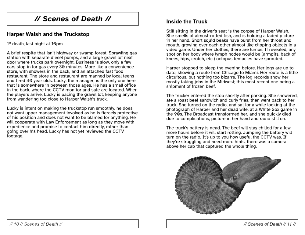 Cephalopod Transform is a Mystery Module for Liminal Horror. Investigators must look into the mysterious deaths of 3 locals, seemingly transformed overnight into rotting tentacled horrors.